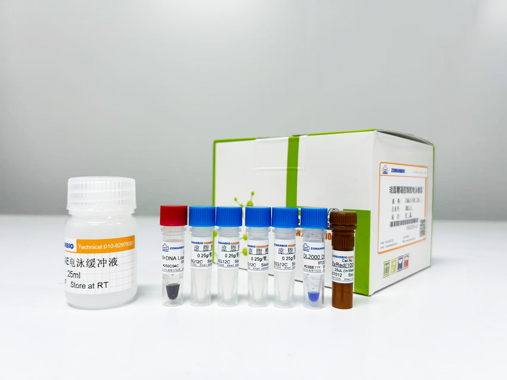 本試劑盒依據(jù)瓊脂糖凝膠電泳實(shí)驗(yàn)原理,提供瓊脂糖、50×電泳緩沖液和核酸染料、6×DNA Loading buffer、 DNA Marker。本產(chǎn)品提供的核酸染料是一種新型核酸染料對人體無毒害。使用時用適量電泳緩沖液將瓊脂糖溶解,并將核酸染料溶解至膠液中混勻制膠,然后將樣品與 6×DNA Loading buffer 混勻后上樣,即可進(jìn)行瓊脂糖凝膠電泳實(shí)驗(yàn)。具有快速簡便、靈敏度高、穩(wěn)定性好等優(yōu)點(diǎn)。