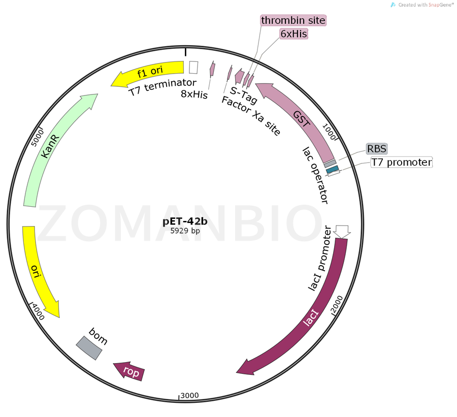pET42系列載體是用來進(jìn)行克隆和高水平表達(dá)含有220個(gè)氨基酸的GST融合純化標(biāo)簽的蛋白表達(dá)載體。