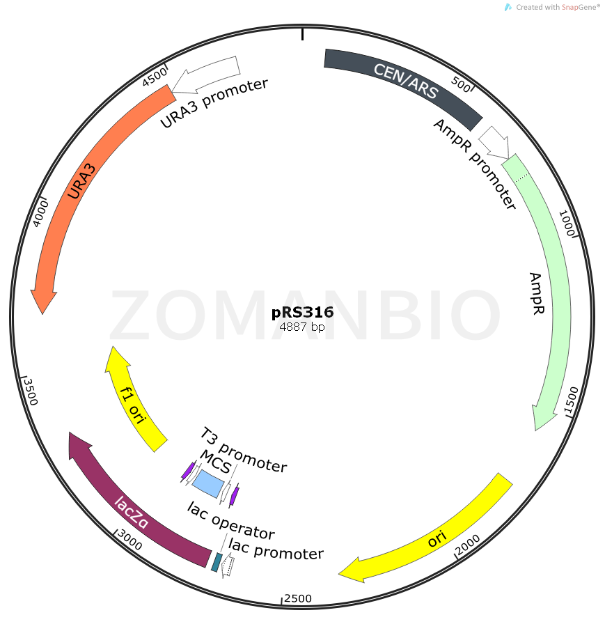 This is one of a series of pBluescriptbased YCtype (centromeric) yeast shuttle vectors (ATCC 7714277145) differing in the yeast selectable marker gene. It encodes the beta galactosidase alpha peptide for blue white color detection of inserts and also has the T7 and T3 promoters for in vitro RNA synthesis and priming sites for sequencing. It is useful in plasmid shuffling experiments. It was constructed by inserting a 1.112 kb fragment containing the URA3 gene into the NdeI site of the pRSS56 vector and also inserting a cassette containing CEN6 and the ARS associated with histone 4 (ARSH4) into the AatII site of the same vector. All ends were blunted. The pRSS56 vector was constructed by ligating a PvuI fragment (bp 4982412) of pBluescript KS+ and the fragment from the unique NdeI and AatII sites between bla and f1 origin of pBS(+). The order of the major features in this plasmid is: URA3 f1 ori (NaeI) T7 promoter lacZ/MCS T3 promoter pMB1 ori bla CEN6 ARSH4.