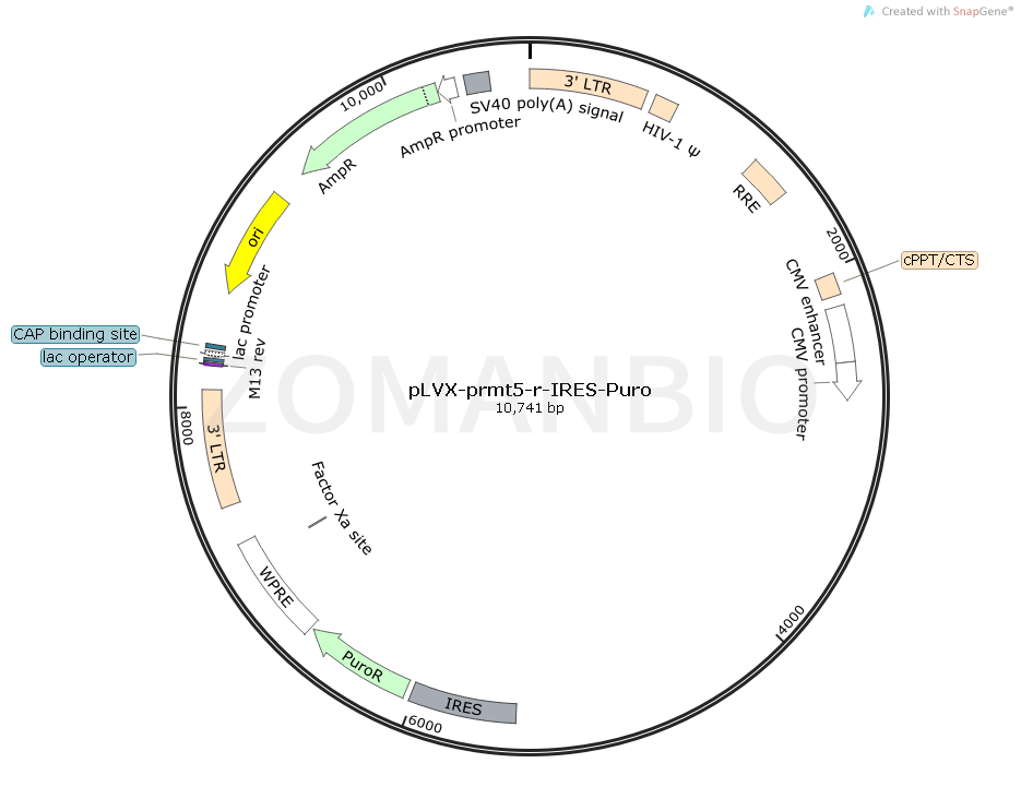 pLVX-prmt5-r-IRES-Puro質(zhì)粒是在pLVX-IRES-Puro背景載體上通過EcoR I 和NotI 酶切位點(diǎn)克隆進(jìn)入大鼠prmt5基因,CMV啟動子驅(qū)動prmt5大鼠源基因表達(dá)。