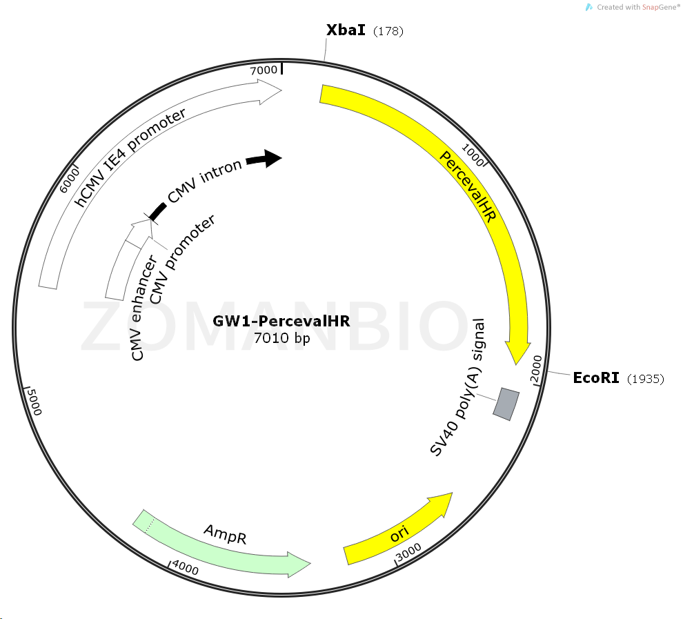 GW1-PercevalHR質(zhì)粒通過hCMV IE4 啟動子驅(qū)動PercevalHR基因的表達,Mammalian expression vector (CMV promoter) of PercevalHR, a fluorescent sensor of ATP-to-ADP ratio.