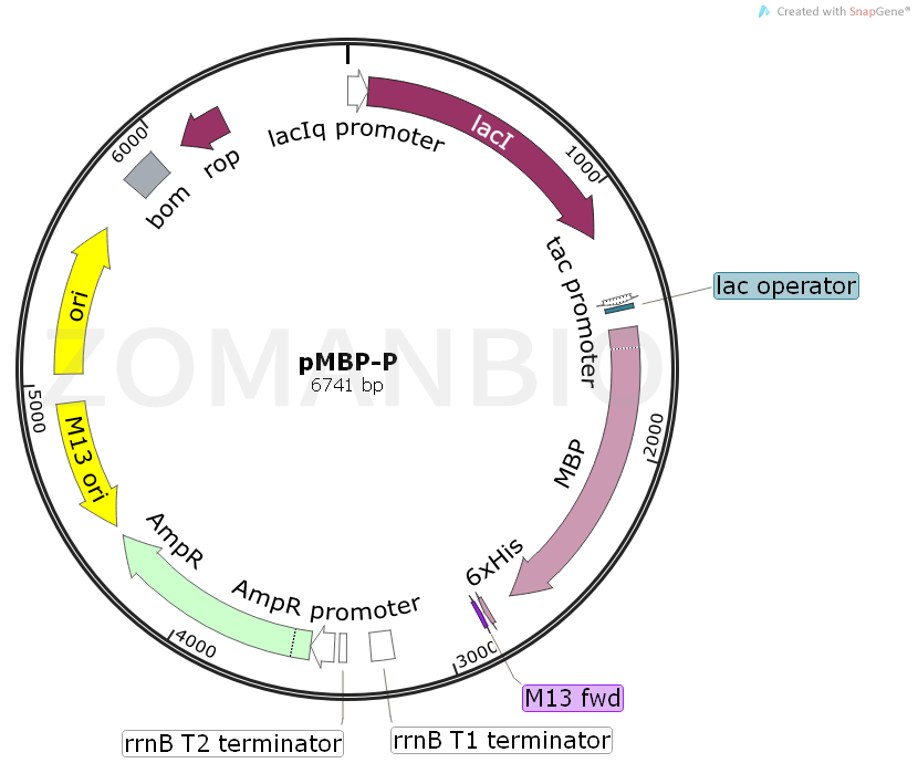 pMBP-P載體需要被IPTG誘導(dǎo)才能在BL21(DE3)中表達(dá),質(zhì)粒大小為6741bp,復(fù)制子是ColE1 ori,是一個(gè)高拷貝質(zhì)粒。