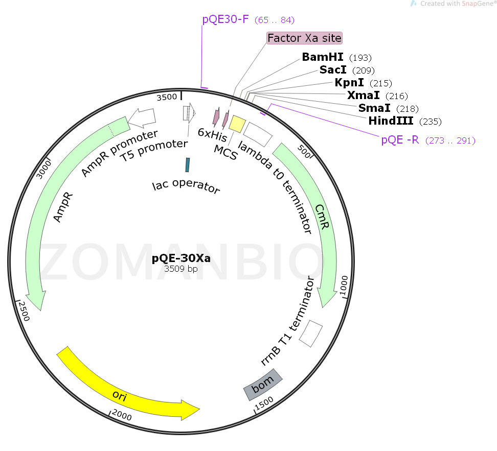 pQE-30Xa質(zhì)粒含有一個(gè)強(qiáng)大的噬菌體T5啟動(dòng)子(被E.coli RNA 聚合酶識(shí)別),并含有兩個(gè)lac操縱子遏制模塊,用于在E.coli中嚴(yán)謹(jǐn)調(diào)控,高水平表達(dá)融合蛋白。在高水平lac遏制子存在的情況下,蛋白合成被有效阻斷,細(xì)胞毒素載體的穩(wěn)定性增強(qiáng),pQE載體可以在重組蛋白的N端或C端帶上6×His標(biāo)簽。