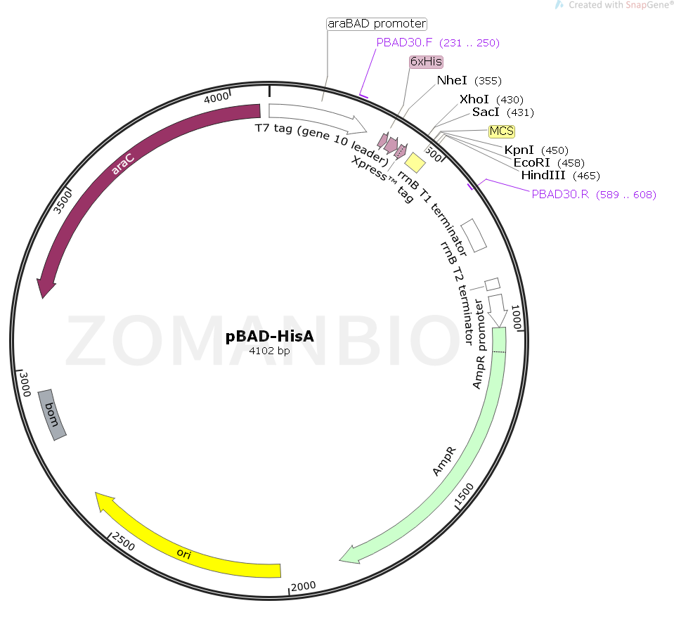 pBAD-HisA質(zhì)粒是衍生于pBR322載體。載體設(shè)計用來在大腸桿菌中進行可調(diào)節(jié),劑量依賴性的表達(dá)和純化重組目的蛋白。使大腸桿菌araBAD啟動子(pBAD)增強了大腸桿菌重組蛋白可溶性表達(dá)的水平。pBAD/His和pBAD/Myc His載體上的調(diào)節(jié)蛋白AraC能夠調(diào)控pBad啟動子。pBAD/Myc-His A 載體是阿拉伯糖調(diào)控載體;在無葡萄糖的培養(yǎng)基中,阿拉伯糖正向調(diào)控目的基因的表達(dá);通過調(diào)節(jié)阿拉伯糖的濃度水平來優(yōu)化目的蛋白的可溶性表達(dá)。