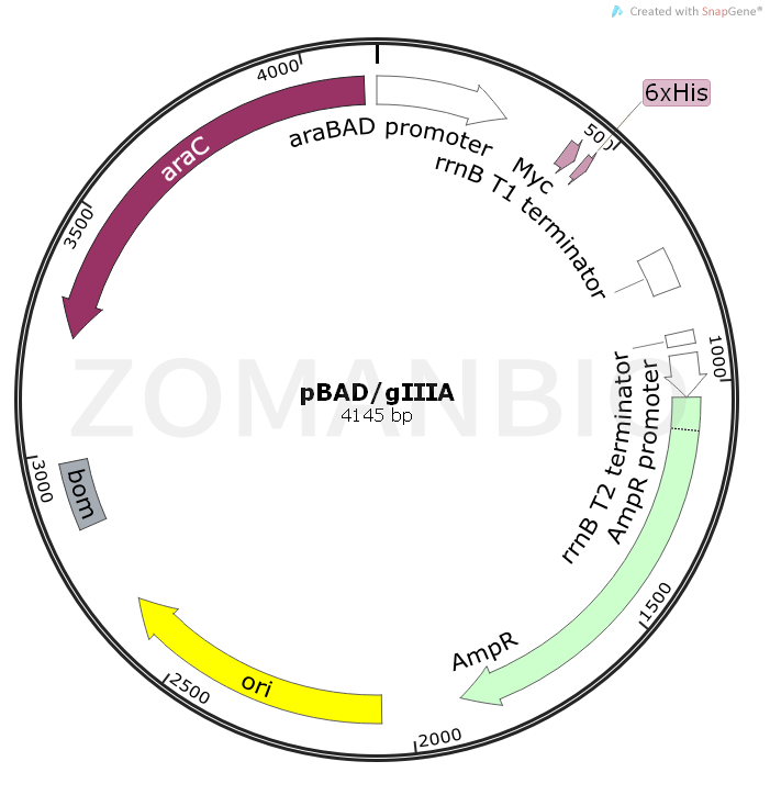 pBAD/gIII載體質(zhì)粒是衍生于pBR322載體。載體設(shè)計(jì)用來在大腸桿菌中進(jìn)行可調(diào)節(jié)分泌性表達(dá)和純化重組目的蛋白。使用基因III信號序列來定位重組蛋白,使其分泌到大腸桿菌周質(zhì)腔中。使用大腸桿菌araBAD啟動(dòng)子(pBAD)增強(qiáng)了大腸桿菌重組蛋白可溶性表達(dá)的水平。載體上的調(diào)節(jié)蛋白AraC能夠調(diào)控pBad啟動(dòng)子。