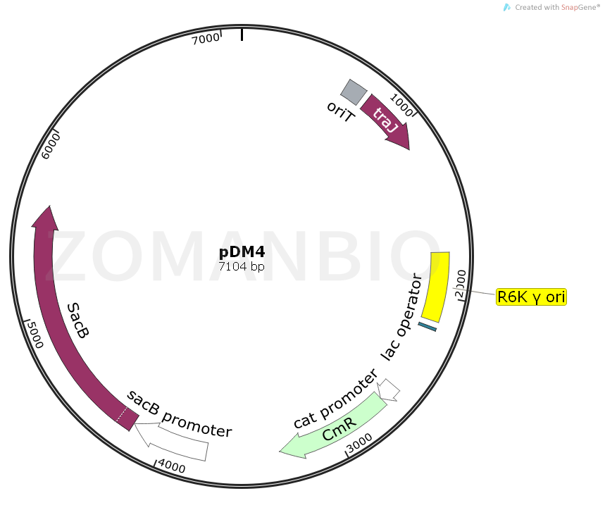 pDM4質(zhì)粒是一種自殺型載體,在轉(zhuǎn)化的時候需要用含pri基因的菌株,復(fù)制子是R6Kγori,oriT,質(zhì)粒大小是7104bp,帶有氯霉素抗性,通過抗生素抗性篩選大量復(fù)制擴(kuò)增,培養(yǎng)條件是LB,37℃,有氧。