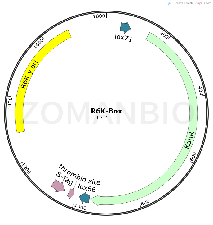 Red重組一定會有一個通過PCR制備線性的打靶盒子(box)的過程。此質粒是Ori R6K控制復制,只在SM10(λpir)的大腸桿菌中復制。故用此質粒為模板構建打靶盒子,不會產生假陽性。此質粒包含lox71-KanR-lox66結構。