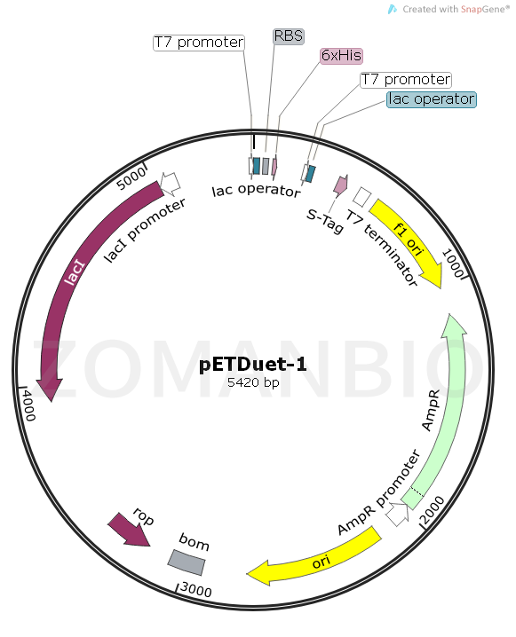 pETDuet-1載體被設(shè)計用來在大腸桿菌中同時表達兩個外源基因. 載體含有兩個多克隆位點,每一個多克隆位點是通過T7啟動子/Lac操縱子和一個核糖體結(jié)合位點組成。pETDuet-1攜帶有pBR322質(zhì)粒來源的ColE1復(fù)制子, lacI基因和氨芐抗性基因。本載體可以與pACYCDuet-1載體聯(lián)合使用,在合適的宿主菌中,可以一起共表達至多4個目的基因。插入在pETDuet-1載體多克隆位點1的目的基因可以使用pET Upstream 引物和DuetDOWN1 引物進行測序,插入在多克隆位點2的目的基因可以通過DuetUP2 引物 和T7 Terminator 引物進行目的基因測序。