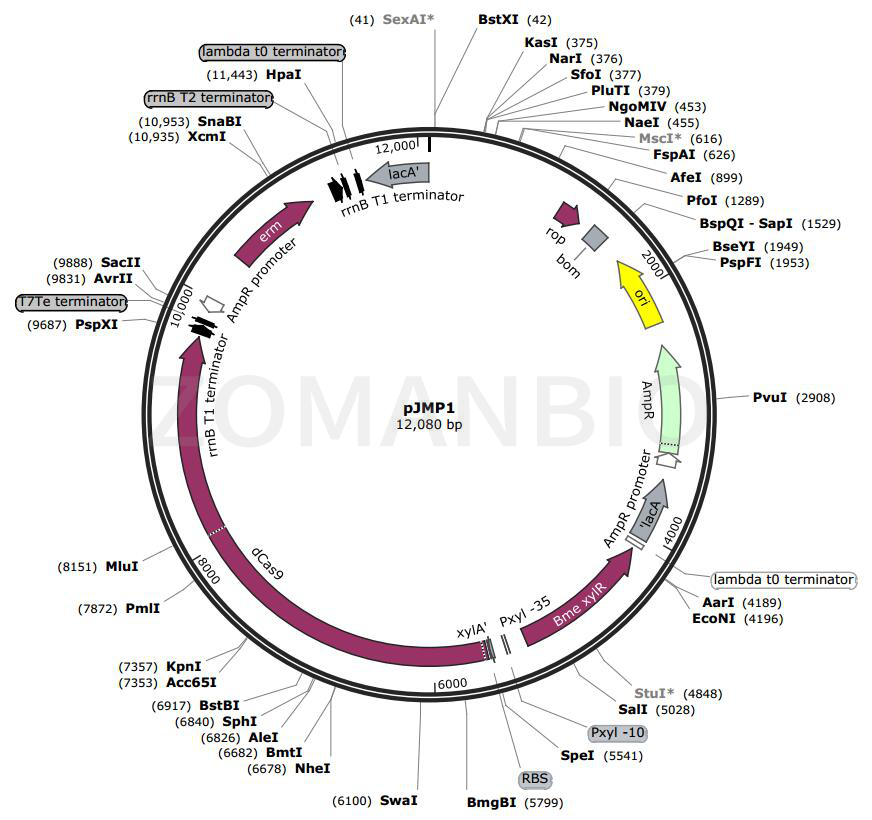 pJMP1質粒是一個枯草桿菌基因編輯質粒。Bacillus subtilis dCas9 expression vector; integrates into lacA/ganA。dcas9 was PCR-amplified from pdCas9-bacteria (Addgene #44249) using primers containing BamHI-compatible BsaI sites, digested with BsaI, then ligated into plasmid pAX01 digested with BamHI to generate pJMP1。