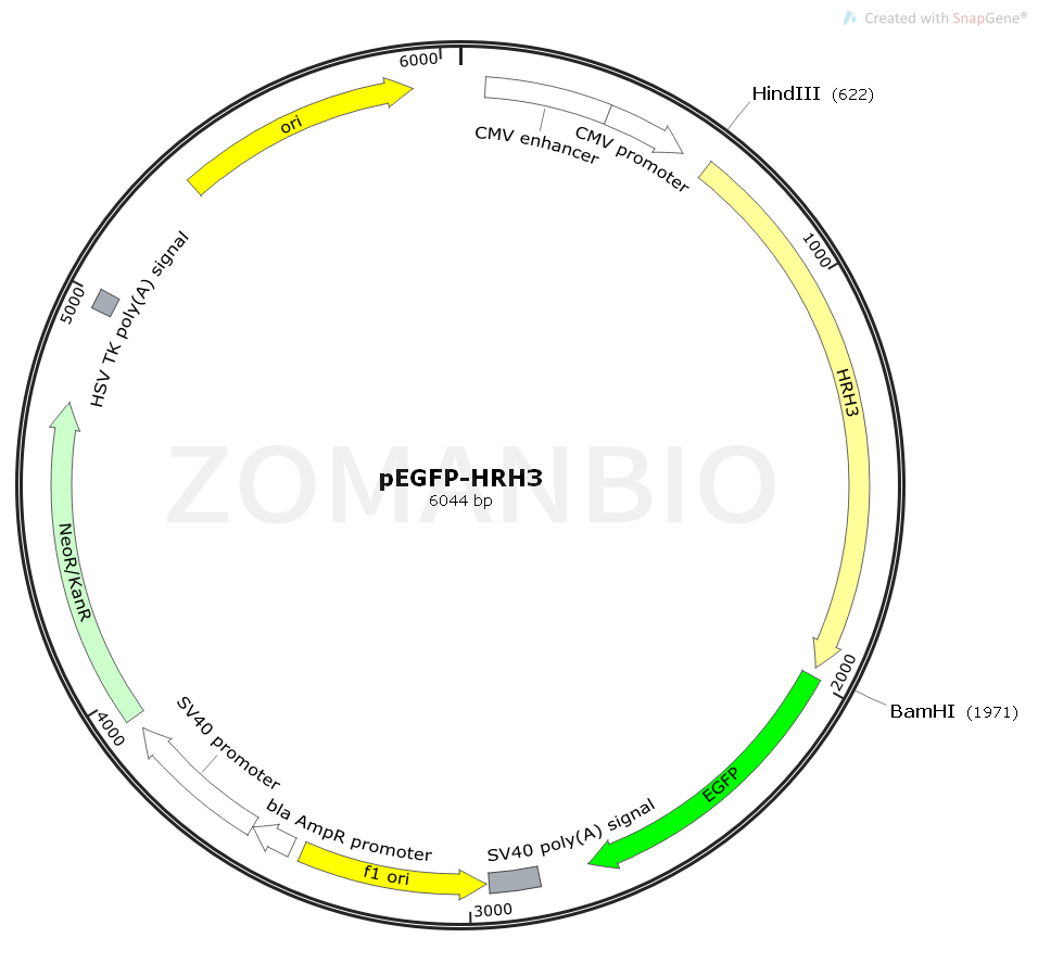 pEGFP-HRH3質(zhì)粒是一個哺乳細(xì)胞過表達(dá)質(zhì)粒,CMV啟動子驅(qū)動HRH3人源基因和EGFP綠色熒光蛋白融合表達(dá)。