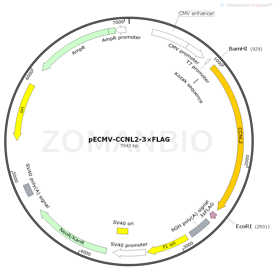 pECMV-CCNL2-3×FLAG質(zhì)粒是一個(gè)哺乳細(xì)胞過表達(dá)質(zhì)粒,CMV啟動(dòng)子驅(qū)動(dòng)CCNL2人源基因和3×FLAG標(biāo)簽融合表達(dá)。