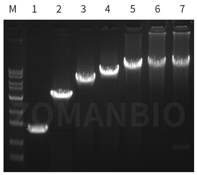 M:DL15000 plus DNA marker 1:1kb 2:3kb 3:5kb 4:8kb 5:11kb 6:16.5kb 7:21kb |