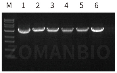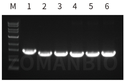 M:DL15000 plus DNA marker 1:人基因組DNA 2:人cDNA 3:玉米基因組DNA 4:菌液 5:菌落 6:λDNA |