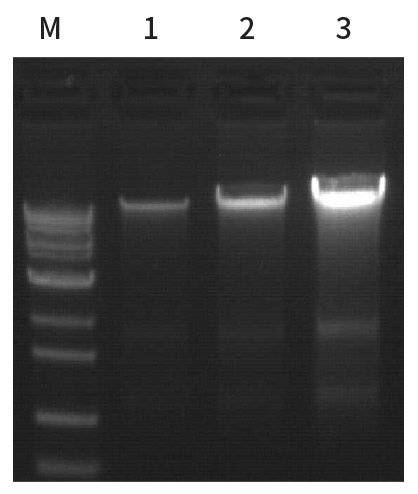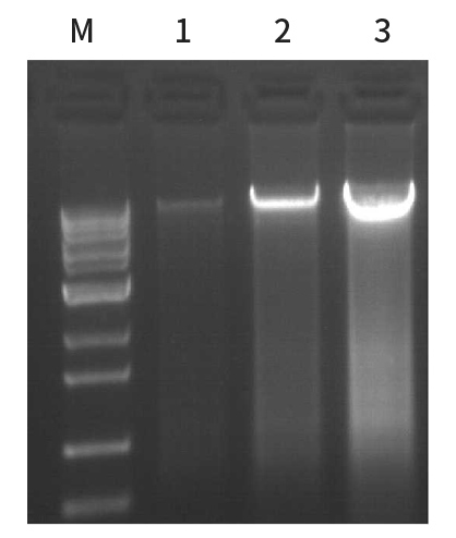 注:M: DL15000 Plus DNA Maker 1: 30 μL 小鼠全血 2: 100 μL小鼠全血 3: 200 uL小鼠全血 |