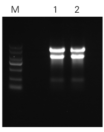 注解: 樣品:寄生曲霉 使用液氮研磨后的50 mg樣品,100μl洗脫 M:DL2000(ZOMANBIO) 1,2:莊盟ZP431提取結(jié)果