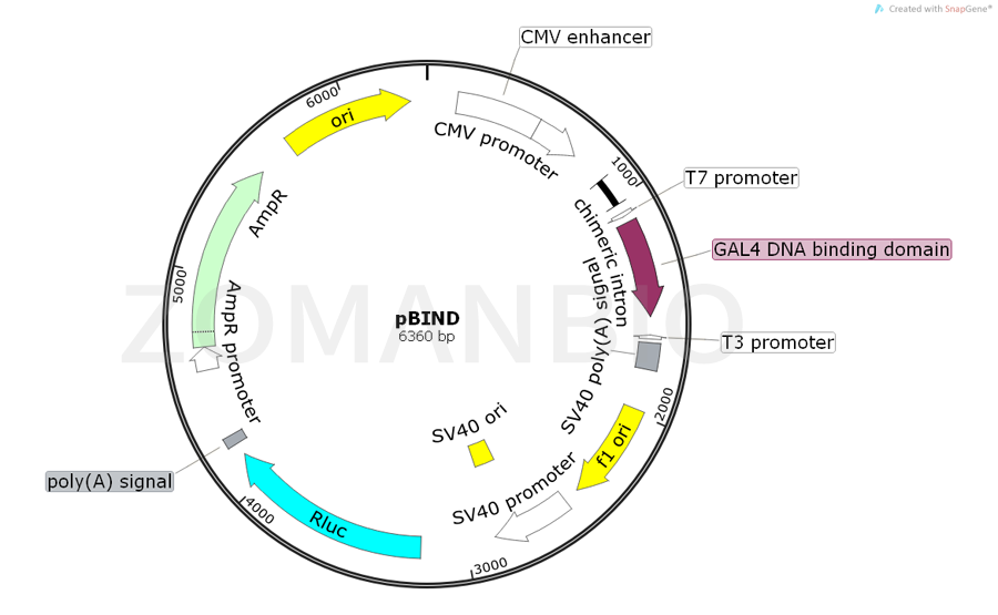 pBIND是高拷貝質粒的CMV即刻早期啟動子在其中的驅動基因表達的酵母GAL4基因在部分(氨基酸1–147)含有DNA結合域。的影響的DNA結合域的序列的載體,是由chimeric flanked多克隆區(qū),內(nèi)含子,終止密碼子和多聚腺苷酸化SV40晚期區(qū)一。該融合基因的T7和T3 flanked區(qū)是由RNA聚合酶的發(fā)起人是目的synthesizing正義和反義RNA的產(chǎn)品,分別。海腎熒光素酶基因的載體,是對本preceded SV40早期啟動子的基因的內(nèi)含子和生長激素。增加蛋白表達的mRNA的內(nèi)含子可以通過穩(wěn)定的運輸?shù)郊毎|和核(9–12)的影響。合成的多聚腺苷酸序列3′睡的海腎熒光素酶基因。在骨干網(wǎng)中包含了一個F1的質粒復制的起源和生產(chǎn)的單鏈DNA(β-內(nèi)酰胺酶基因在大腸桿菌中的表)的選擇。