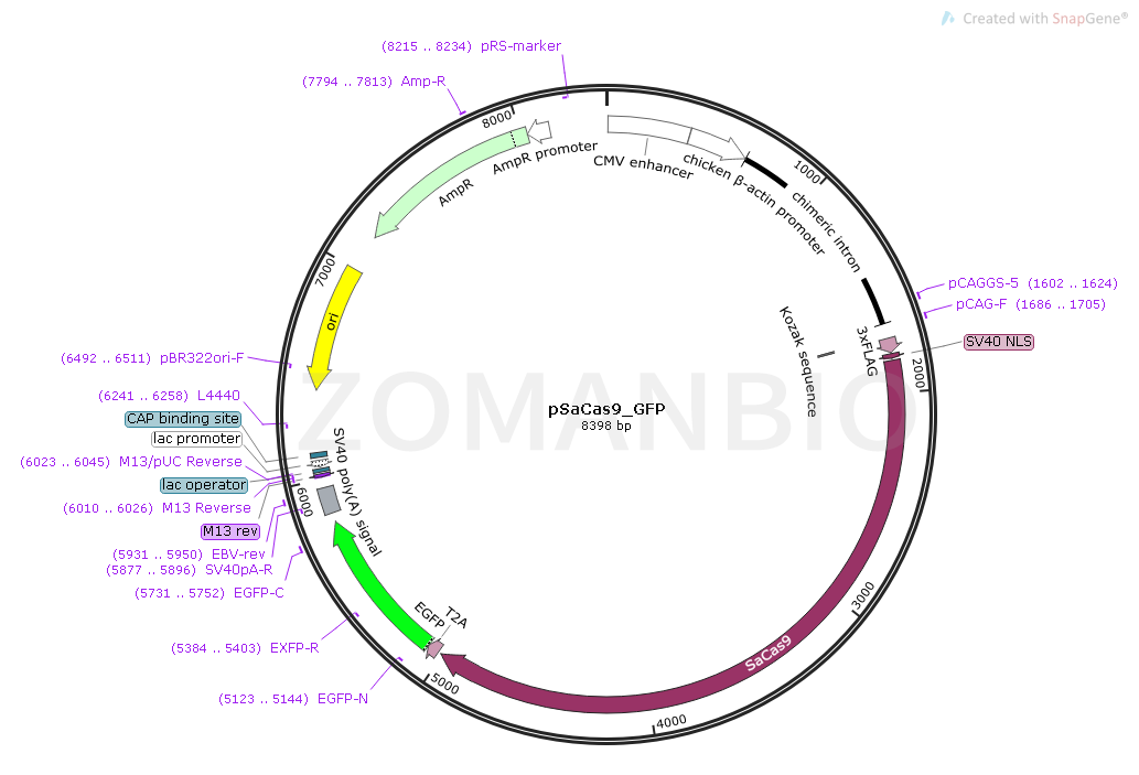 質粒序列可參考(具體以測序為準)下載:ZK640 pSaCas9_GFP哺乳編輯質粒.txt