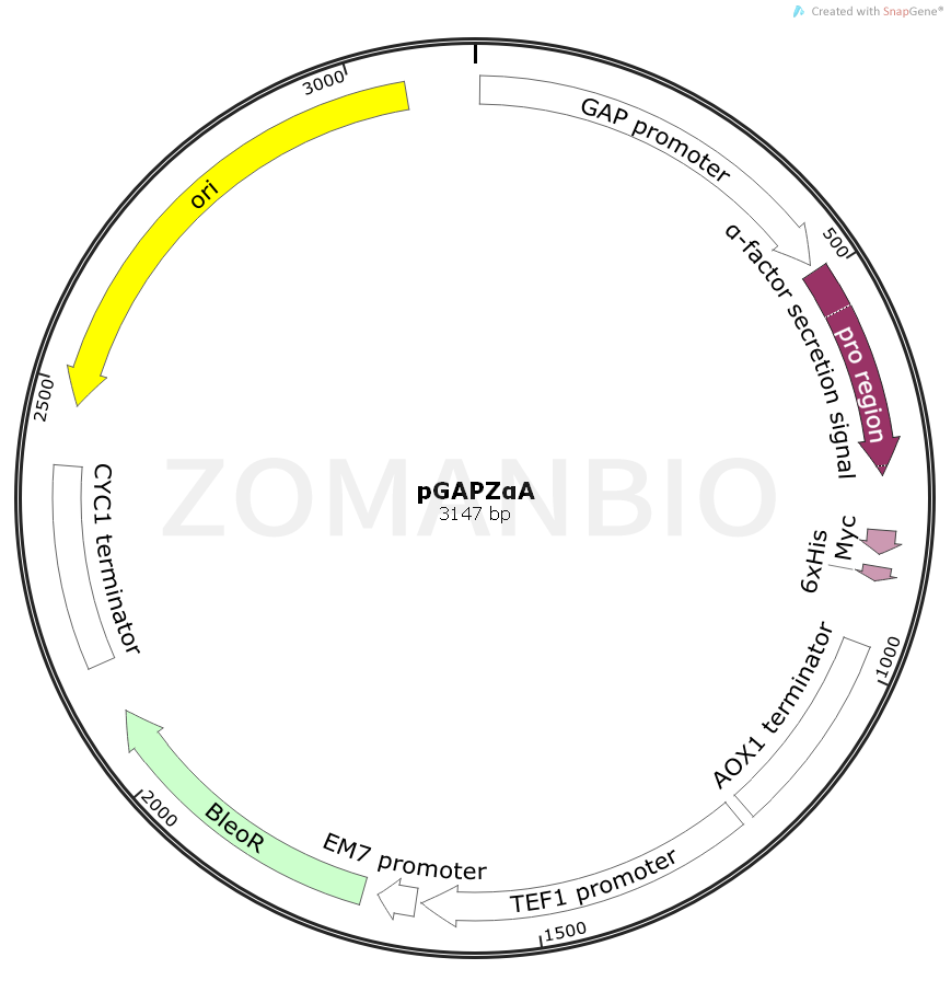 甘油醛-3-磷酸脫氫酶(GAPDH)的酶在許多生物細(xì)胞中包括畢赤酵母,穩(wěn)定高水平表達(dá)。最近GAPDH蛋白編碼基因啟動(dòng)子(GAP)被深入研究,并在畢赤酵母中能夠高水表達(dá)重組蛋白,這取決于使用的碳源(Waterham等 人,,1997)。GAP啟動(dòng)子(PGAP)的重組蛋白表達(dá)水平略高于AOX1啟動(dòng)子。pGAPZ A,B,和C載體(2.9 KB)和pGAPZαB和C(3.1 KB)載體使用GAP啟動(dòng)子在畢赤酵母中穩(wěn)定表達(dá)重組蛋白。重組蛋白表達(dá)為為帶有C-末端myc抗原表位和C端His標(biāo)簽的融合蛋白。此外,pGAPZα 表達(dá)的融合蛋白在N-端帶有釀酒酵母(Saccharomyces cerevisiae)的α-因子分泌信號肽。這兩個(gè)系列的載體都提供三個(gè)不同讀碼框的載體,以方便克隆的帶有C-端標(biāo)簽和/或N-末端分泌信號肽的載體中。