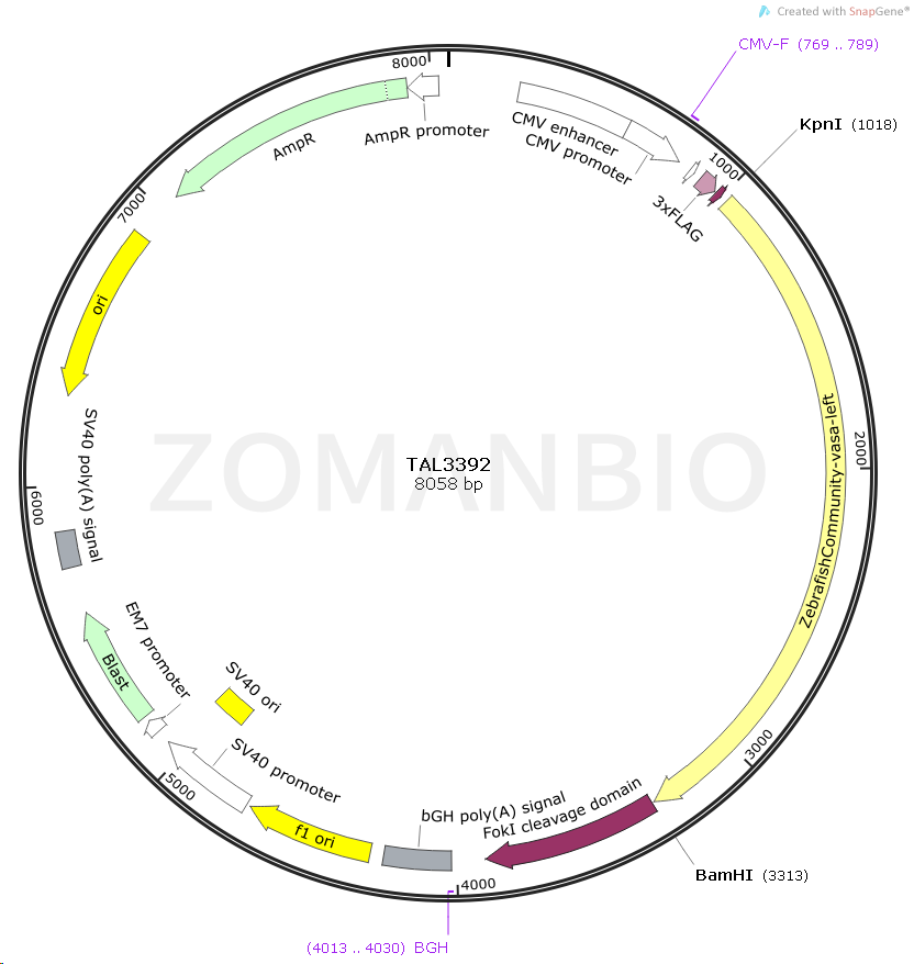 TAL3392質(zhì)粒是一個CMV啟動表達(dá)斑馬魚的 ZebrafishCommunity-vasa-left 基因的真核表達(dá)質(zhì)粒。