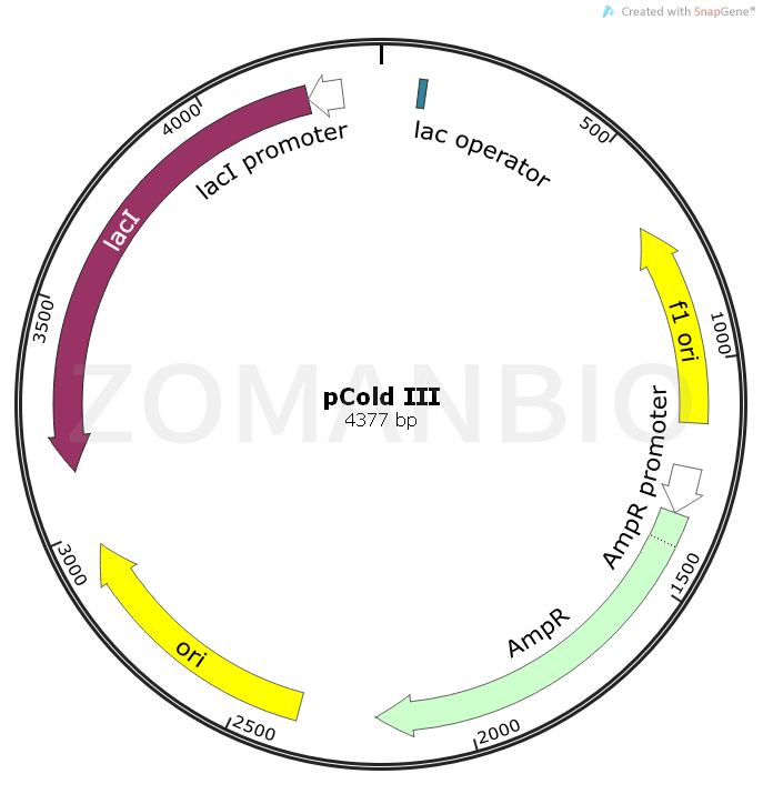 pCold III質(zhì)粒是利用冷休克基因CspA啟動子設(shè)計(jì)高效率蛋白質(zhì)表達(dá)載體。在啟動子下游處,插入了lac操縱子,以便嚴(yán)格控制表達(dá)。此外,5’非翻譯區(qū)(5’UTR),翻譯增強(qiáng)元件(TEE),His標(biāo)簽序列,Xa因子切割位點(diǎn)和多克隆位點(diǎn)(MCS)位于CAPS啟動子的下游。當(dāng)培養(yǎng)溫度切換到低溫時(shí),大腸桿菌暫時(shí)停止生長,大部分的大腸桿菌蛋白質(zhì)表達(dá)減少,但是一類稱為冷休克蛋白的蛋白質(zhì)被特異性誘導(dǎo)表達(dá)。
