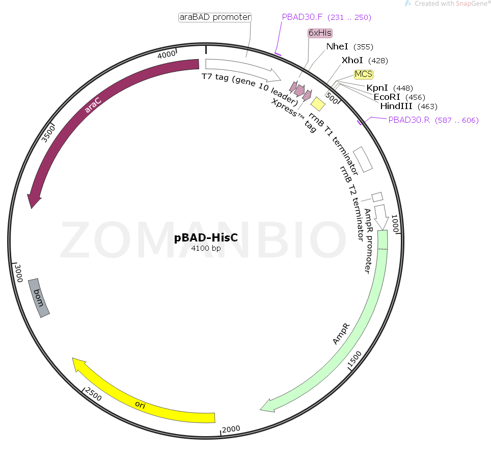 pBAD/His和PBAD/Myc-His載體質(zhì)粒是衍生于pBR322載體。載體設(shè)計(jì)用來在大腸桿菌中進(jìn)行可調(diào)節(jié),劑量依賴性的表達(dá)和純化重組目的蛋白。使用大腸桿菌araBAD啟動(dòng)子(pBAD)增強(qiáng)了大腸桿菌重組蛋白可溶性表達(dá)的水平。pBAD/His和pBAD/Myc His載體上的調(diào)節(jié)蛋白AraC能夠調(diào)控pBad啟動(dòng)子。pBAD/Myc-His A 載體是阿拉伯糖調(diào)控載體;在無葡萄糖的培養(yǎng)基中,阿拉伯糖正向調(diào)控目的基因的表達(dá);通過調(diào)節(jié)阿拉伯糖的濃度水平來優(yōu)化目的蛋白的可溶性表達(dá)。