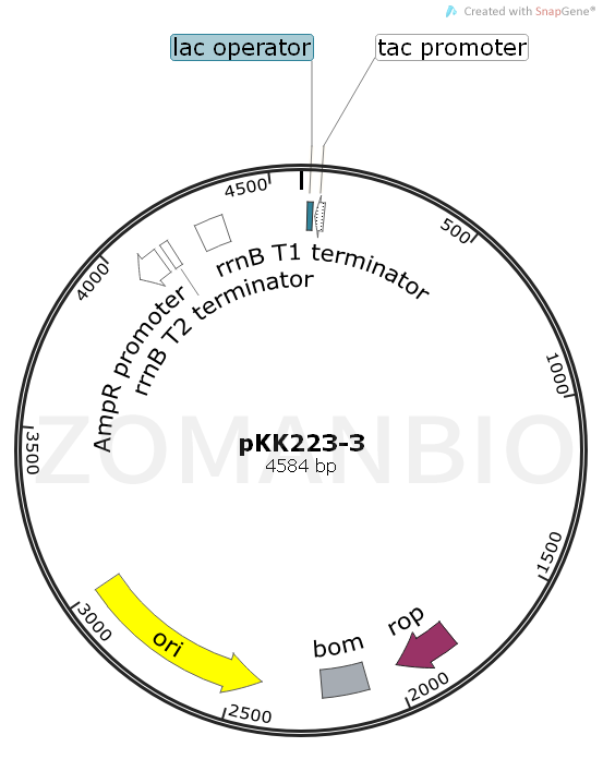 pKK223-3 (1) contains the strong tac promoter upstream from the multiple cloning site and the strong rrnB ribosomal terminator downstream for control of protein expression (2-4). Induction: tac promoter is inducible with 1-5 mM IPTG. Promoter is very strong; even uninduced cells may show a low level of expression. Expression: Genes containing a ribosome-binding site and ATG can be inserted into any unique site in the MCS for expression. The ribosomebinding site on the plasmid can be utilised to express inserts if the ATG start codon of the insert is within 5-13 bp from the provided ribosomebindingsite (5, 6). Transcription terminators: rrnB transcription terminators stabilize the plasmid by inhibiting read-through transcription initiated from the tac promoter in the parent plasmid. Host(s): lac Iq strains; E. coli JM105 is recommended. Selectable marker(s): Plasmid confers resistance to 100 μg/ml ampicillin. Amplification: Recommended. Control Regions: Expression control region: tac promoter: -10: 50-44; -35: 72-67; Ribosome binding site: 11. MCS: 4552-4587. rrnB operon region: 5S rRNA region: 4471-4352; rrnB T1 terminator: 4348-4305; rrnB T2 terminator: 4173-4146. b-lactamase gene region: Promoter: -10: 4082-4077; -35: 4105-4100; Start codon (ATG): 4035; Stop codon (TAA): 3178. Plasmid replication region: Site of replication initiation: 2417-2415; Region necessary for replication: 3111-2415.