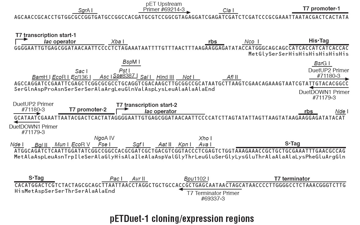 pETDuet-1載體被設(shè)計用來在大腸桿菌中同時表達兩個外源基因. 載體含有兩個多克隆位點,每一個多克隆位點是通過T7啟動子/Lac操縱子和一個核糖體結(jié)合位點組成。pETDuet-1攜帶有pBR322質(zhì)粒來源的ColE1復(fù)制子, lacI基因和氨芐抗性基因。本載體可以與pACYCDuet-1載體聯(lián)合使用,在合適的宿主菌中,可以一起共表達至多4個目的基因。插入在pETDuet-1載體多克隆位點1的目的基因可以使用pET Upstream 引物和DuetDOWN1 引物進行測序,插入在多克隆位點2的目的基因可以通過DuetUP2 引物 和T7 Terminator 引物進行目的基因測序。