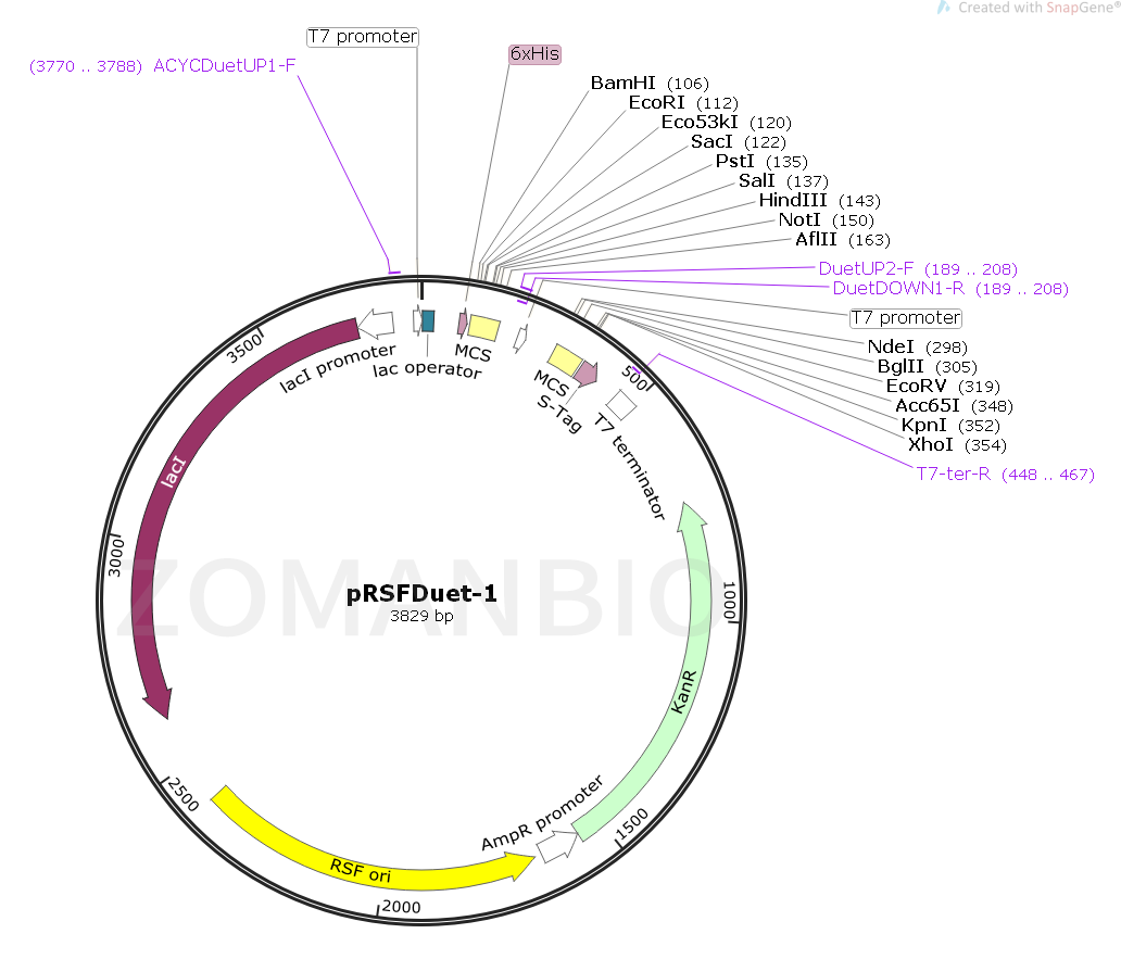 該質(zhì)粒還攜帶有RSF復(fù)制因子、lacI基因和氯霉素抗性基因??梢允惯@個pETDuet-1載體在一個適當(dāng)?shù)乃拗骶甑腸oexpression 4目標(biāo)基因插入MCS1的基因可以使用ACYCDuetUP1引物和DuetDOWN1引物進(jìn)行測序。插入MCS2的基因可以用DuetUP2引物和T7進(jìn)行排序。