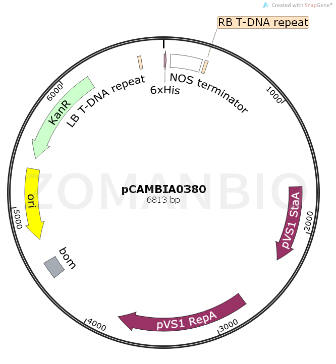 This vector contains a range of restriction sites on either side of the pUC8 polylinker, making it suitable for advanced construction purposes with users inserting their own promoters, selection genes, reporter genes. The only functional signals between the T-DNA borders are the start and stop codons, the histidine tag, and the NOS-poly(A) signal.