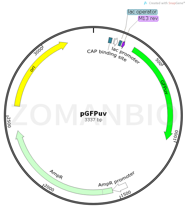 pGFPuv是一個(gè)大腸桿菌綠色熒光表達(dá)質(zhì)粒。pGFPuv carries the“cycle 3”variant of GFP described by Crameri et al. (1). This gene was cloned between the two MCSs of the pUC19 derivative pPD16.43 (2). The GFPuv gene canbe easily excised from pGFPuv. Alternatively, the GFPuv coding sequence can be amplified by PCR. The GFPuv gene was inserted in frame with the lacZ initiation codon from pUC19 so that a β-galactosidase-GFPuv fusionprotein is expressed from the lac promoter in E. coli . Note, however, that if you excise the GFPuv coding sequence using a restriction site in the 5' MCS, the resulting fragment will encode the native (i.e.,non-fusion) GFPuv protein. The pUC backbone of pGFPuv provides a high copy number origin of replication and ampicillin resistance gene for propagation in E. coli.