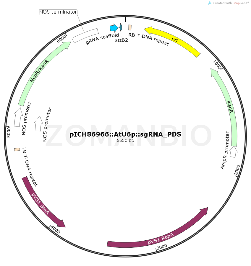質粒序列請下載:ZK2080 pICH86966 AtU6p sgRNA_PDS植物編輯質粒.txt